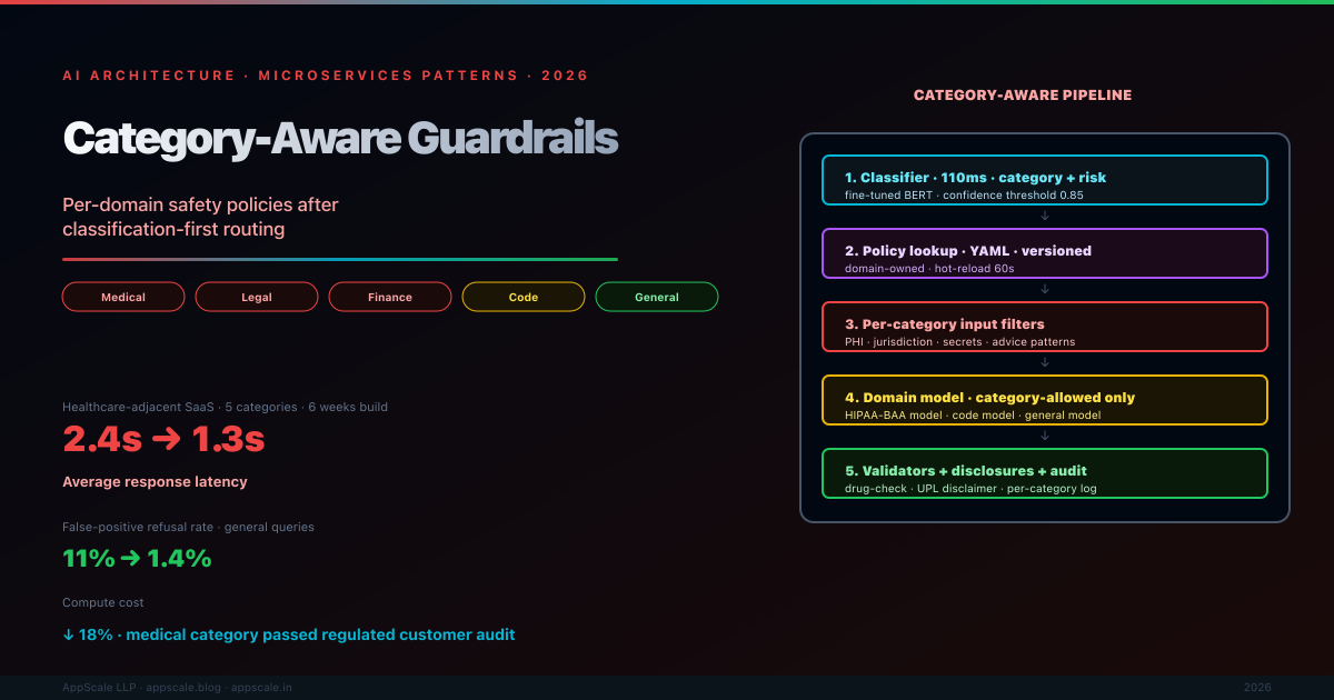 The single biggest mistake in production AI safety is treating the guardrail layer as a global, category-blind filter. Run medical, legal, finance, code, and general queries through one global guardrail and you get the worst of both worlds: under-protected high-risk categories, over-restricted general traffic, and a guardrail layer that fails compliance audit. Category-aware guardrails fix this by treating safety as a per-domain policy executed after the classification-first router has decided which category a request belongs to. This article covers the pattern in detail: structuring per-category policies (medical, legal, finance, code, general), integration with the classification-first router, the production case study showing 2.4s → 1.3s latency and 11% → 1.4% false-positive reduction, the anti-patterns that defeat the pattern, and the configuration values that work at scale.