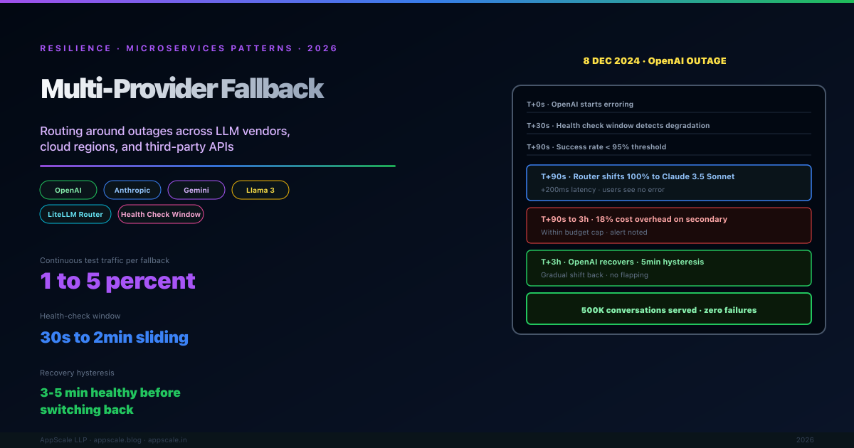 The OpenAI outage of December 2024 and the Anthropic capacity event of March 2025 took every dependent application offline. The multi-provider fallback pattern addresses this directly: pre-validate alternative providers, automate health-check-based switching, and ensure the application continues to function when any single provider goes down. This article covers multi-provider architecture for LLMs, payments, SMS, and cloud services; how to handle schema and behaviour differences; cost and quality trade-offs; the failure-detection logic that triggers switching; the failure modes the pattern itself can introduce; and the operational discipline of keeping the secondary path actually working when needed.