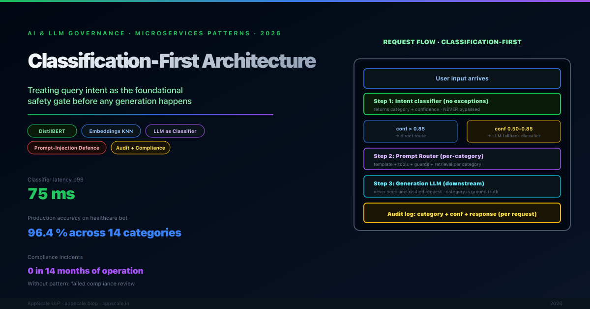 The most common AI architecture mistake of 2024 and 2025 was sending the user's raw input directly into the language model and hoping the prompt was clever enough to handle every case. The mistake produced predictable failures: medical chatbots that gave dosing advice, support bots jailbroken into discussing competitors, internal copilots that exfiltrated data because the prompt did not know what kind of question it was answering. Classification-first inserts a small fast classifier in front of the LLM whose only job is to determine intent and route the request accordingly. This article covers the foundational role of intent classification, implementation patterns (fine-tuned small models, embedding routing, LLM-as-classifier, hybrid), composition with prompt routing and per-category guardrails, anti-patterns, configuration values, and operational discipline of monitoring accuracy and drift over time.