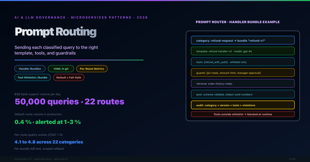 Once an AI system has a classifier producing a category for every request, the obvious next question is: now what? The category by itself does nothing — it must drive a decision about which prompt template formats the request, which tools the model is allowed to call, which retrieval index to query, which guardrails to apply, which model variant to run, and which post-processing rules to enforce. The prompt routing pattern is the explicit, declarative mapping from category to handler bundle: each category points at a complete recipe of template + tools + guards + model + retrieval + post-processing. This article covers the role of explicit per-category bundles, implementation patterns (YAML, database registry, code-based, hybrid), composition with classification-first and versioned templates, anti-patterns, configuration values, and the operational discipline of monitoring per-route quality independently.