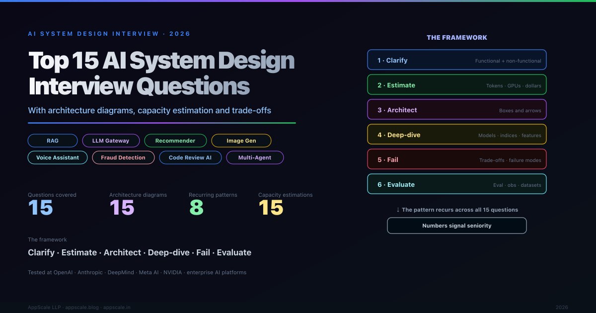 AI system design interviews in 2026 are not the system design interviews of 2020. The senior bar now includes designing a multi-tenant LLM gateway, a real-time recommendation engine with two-tower retrieval and a learned-to-rank reranker, an image moderation pipeline grounded in policy, and a fraud detection system fusing streaming features with an online graph model. This guide walks through 15 of the most commonly asked AI system design questions — RAG, LLM gateway, recommendation, image generation, LLM search, inference platform, fraud, code review AI, voice assistant, evaluation platform, multi-agent orchestration, vector database, content moderation, MLOps, AI tutor — each with clarifying questions, capacity estimation, an architecture diagram, and the trade-offs interviewers listen for.