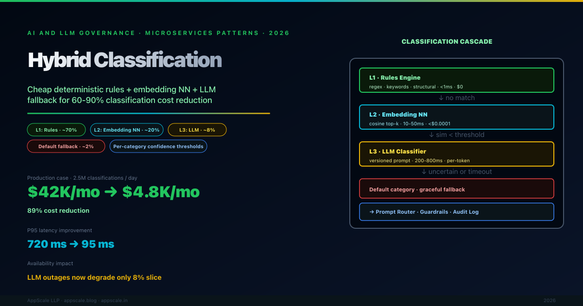 The classifier sits at the entrance to every well-designed AI system. The obvious implementation is to use an LLM. It works on day one. By month three, the team is paying tens of thousands per month for classification, watching tail latency drift upwards, and absorbing classifier outages every time the model provider has an incident. The hybrid classification pattern fixes this with a tiered pipeline: cheap deterministic rules handle 60-80% of traffic at near-zero cost; an embedding nearest-neighbour classifier handles 10-25% at sub-cent cost; the LLM handles only the genuinely ambiguous 5-15%. The economic effect is a 60-90% cost reduction; the architectural effect is more important — the system stops paying frontier-model latency for trivial decisions and the failure surface narrows. This article covers the three-layer pipeline, confidence-threshold tuning per category, training-data sourcing, fallback ordering, composition with Classification-First and Prompt Routing, anti-patterns, and configuration values.