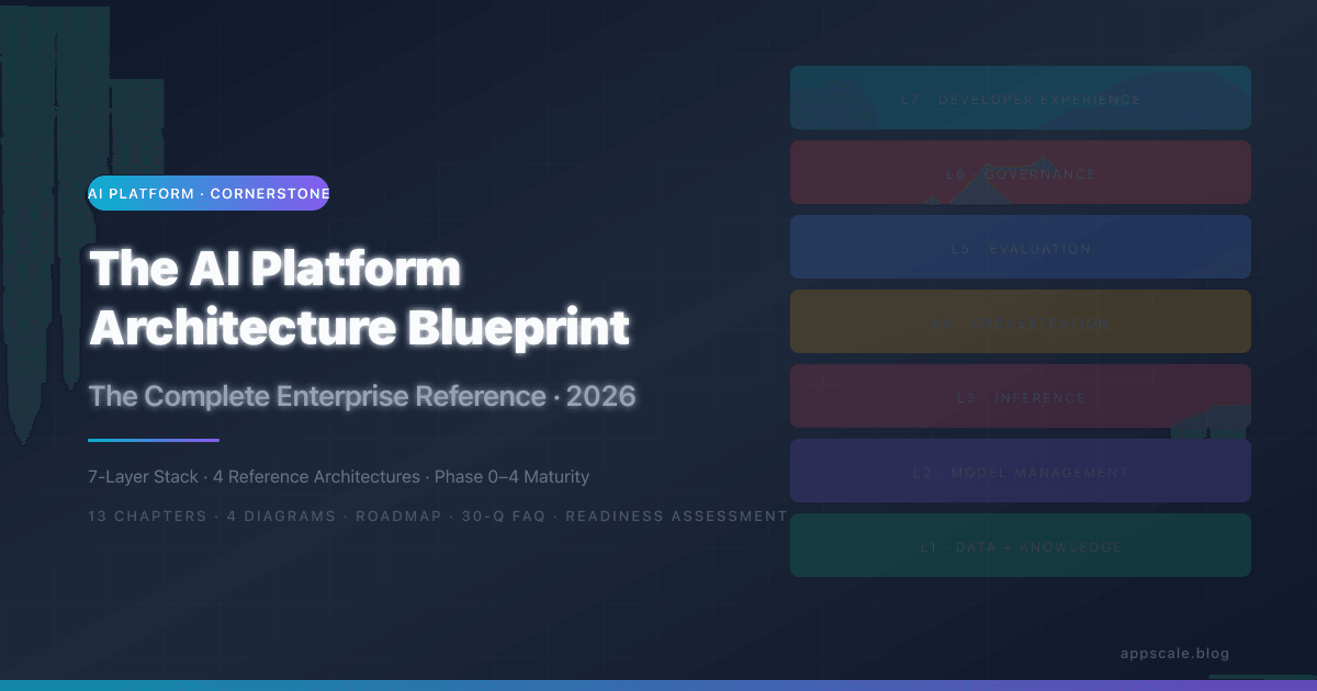A complete 13-chapter enterprise reference for designing, building, and evolving an AI platform — the shared substrate that lets every team ship AI features without rebuilding the same plumbing. Covers the 7-layer platform model (data, model management, inference, orchestration, evaluation, governance, developer experience), 4 reference architectures (Startup, Growth, Enterprise, Regulated-Industry), the model lifecycle and registry, multi-tenant data isolation, semantic caching and routing, FinOps with attribution and budget guardrails, EU AI Act and HIPAA-aligned governance, and the Phase 0 to Phase 4 maturity roadmap with team sizes and timelines. Includes a 20-question platform readiness assessment and a 30-question FAQ optimized for the decisions enterprise architects actually face.