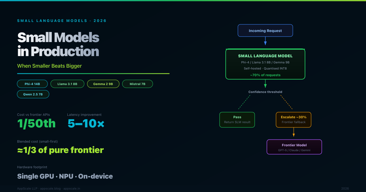 The default — pick the largest frontier model and route every request through it — is the wrong default for a meaningful share of production workloads in 2026. Small language models in the 2 to 14 billion parameter range (Phi-4, Llama 3.1 8B, Gemma 2, Mistral 7B, Qwen 2.5) handle classification, extraction, summarisation, and RAG re-ranking at one-fiftieth the cost per token of frontier models, with 5 to 10x lower latency. This guide covers the workloads where SLMs win, the model families and hardware to choose, the role of quantisation and fine-tuning, and the small-first routing pattern with frontier model fallback that most mature deployments converge on.