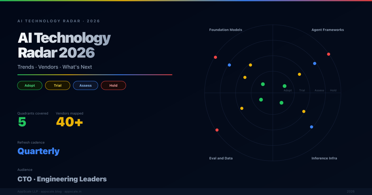 The 2026 AI landscape is no longer a single curve with one obvious winner — it is a fractured ecosystem of frontier models, open-weight families, specialised inference hardware, agent frameworks, and a maturing evaluation stack. This radar maps 40+ technologies across five quadrants and four rings (Adopt · Trial · Assess · Hold) so a CTO can decide where to direct attention and budget for the next twelve to eighteen months. Includes the Adopt-tier defaults, the Trial-tier experiments worth running this quarter, and the Hold-tier deployments that need a migration plan.